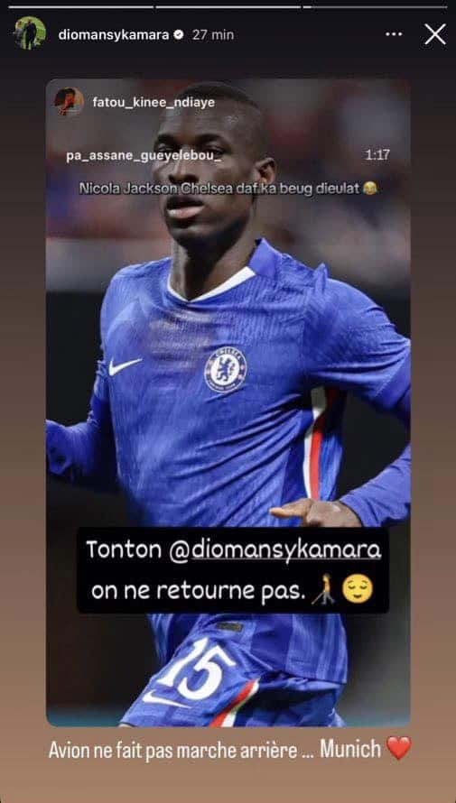 Sauf qu’à la dernière minute, Chelsea, qui a pourtant poussé le joueur vers la sortie pendant tout l’été, est revenu sur sa décision de le laisser filer au Bayern suite à la blessure de Liam Delap lors d’un match contre Fulham, ce samedi. Mais les choses sont loin d’avoir été réglées, d’autant plus que Jackson et ses agents ne comptent pas revenir en arrière. C’est du moins ce qu’à fait comprendre Diomansy Kamara sur une Story Instagram.