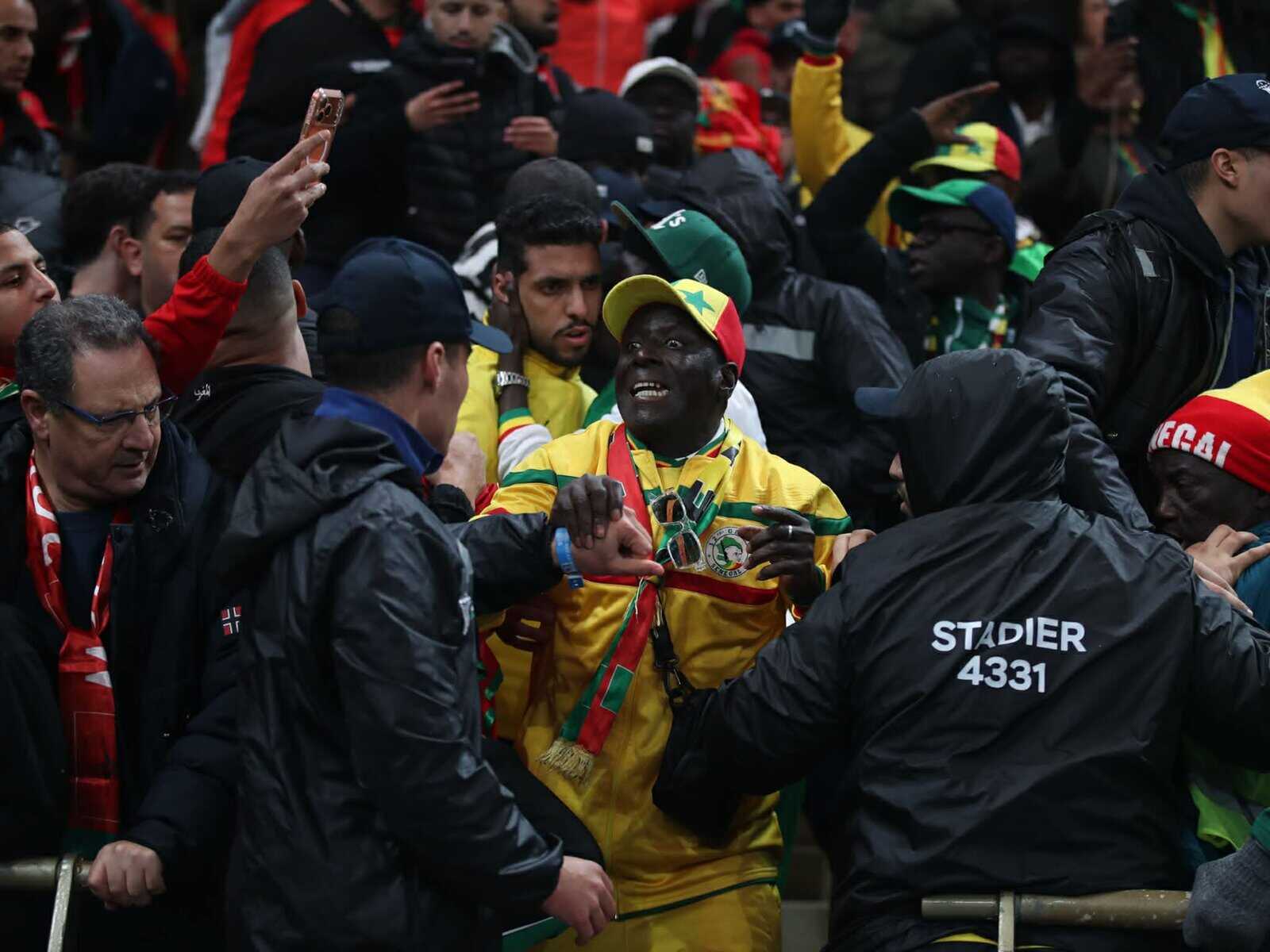 « Quand le penalty a été sifflé, des gens ont commencé à pousser de l’arrière de la tribune. Pour ne pas se faire écraser, ils ont dépassé la barrière en demandant aux stadiers de leur laisser le temps de reculer, pour qu’ils puissent reprendre leur place. Mais ces supporters parlaient en wolof et ces stadiers leur répondaient en arabe, donc ils ne se comprenaient pas. Et, à leur grande surprise, un stadier a alors pris une chaise et l’a jetée sur eux », défend Kabou, qui théorise une « judiciarisation de la frustration » marocaine, née de cette défaite.